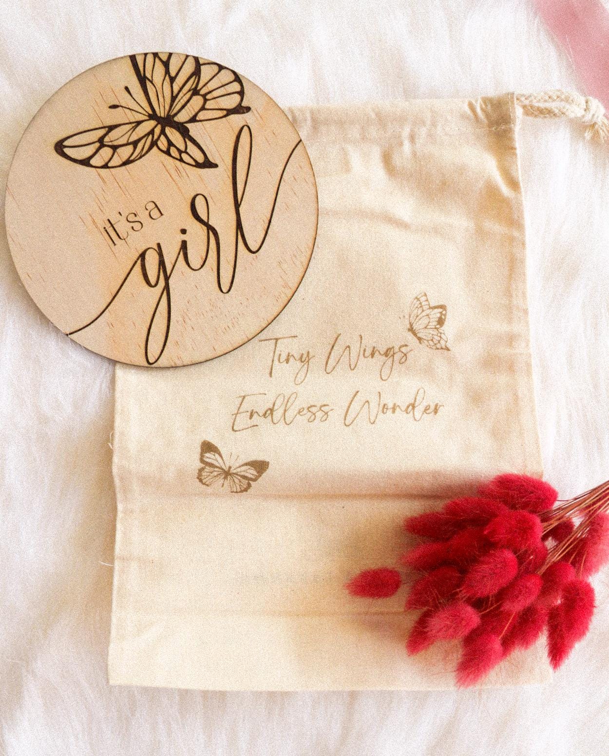 Each plaque is laser-engraved on natural wood, designed with love and attention to detail – Packaged in a soft cotton drawstring pouch, engraved with “Tiny Wings, Endless Wonder”, this set is as thoughtful as it is beautiful — a keepsake parents will treasure forever. perfect for monthly baby photos, nursery décor, or as a timeless keepsake for your little one’s memory box.