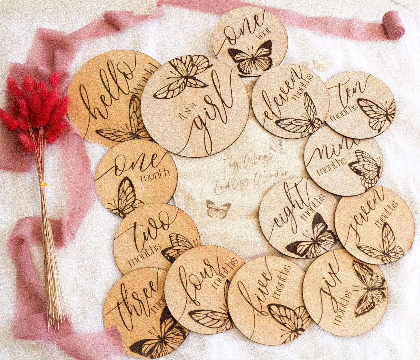 Butterfly Baby Milestone Discs – Wooden Keepsake Set (12 months + Birth Announcement)